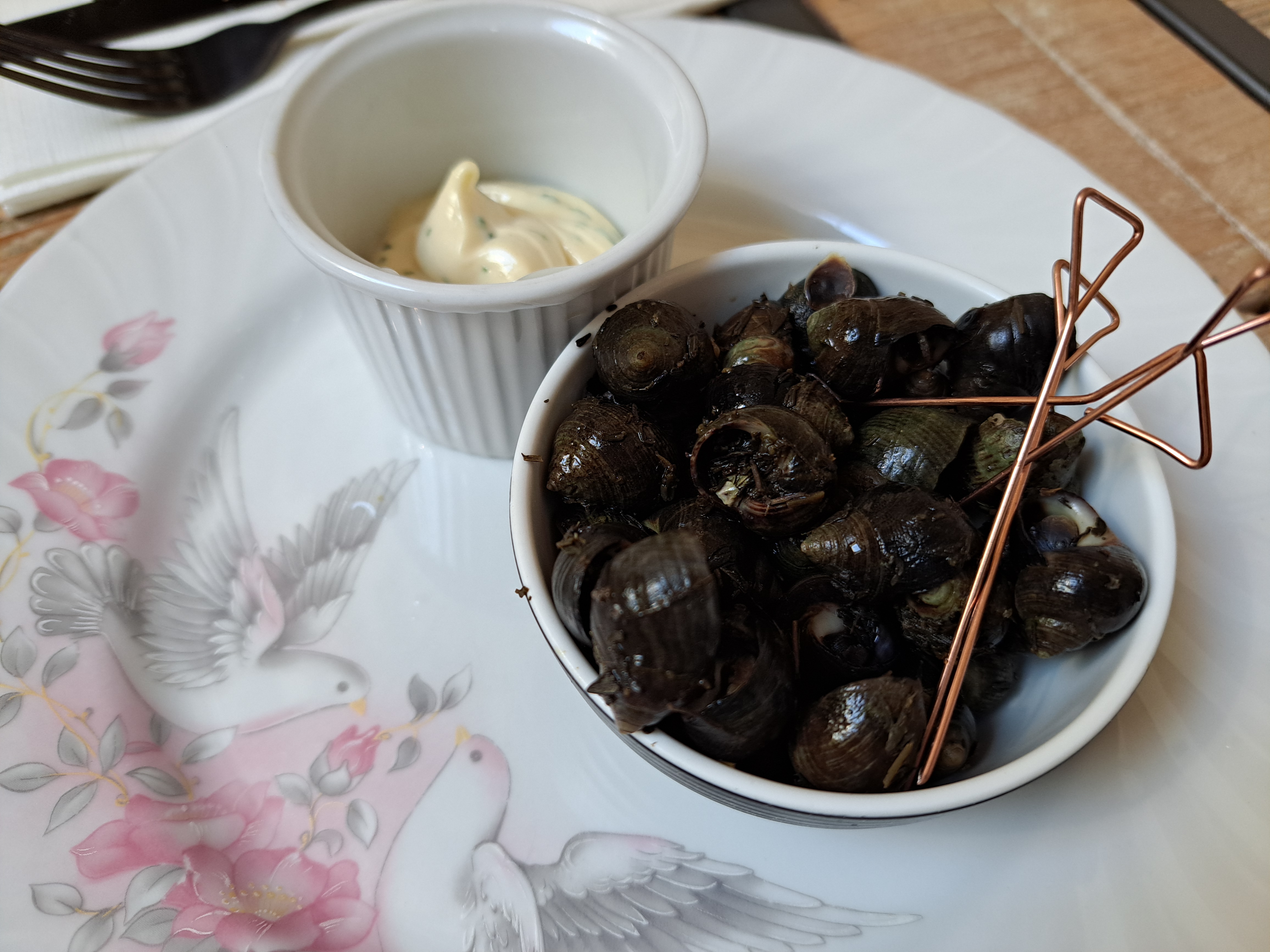 남편은 전채로 생선 리예뜨, 메인은 오늘의 생선(이날은 숭어였음)을 시켰고, 나는 굴 6피스, 뷸로(물레고둥), 비고르노(총알고둥)를 시켰는데 이날 뷸로가 아직 준비가 안 되었다고 해서 굴이랑 비고르노만 먹었다.