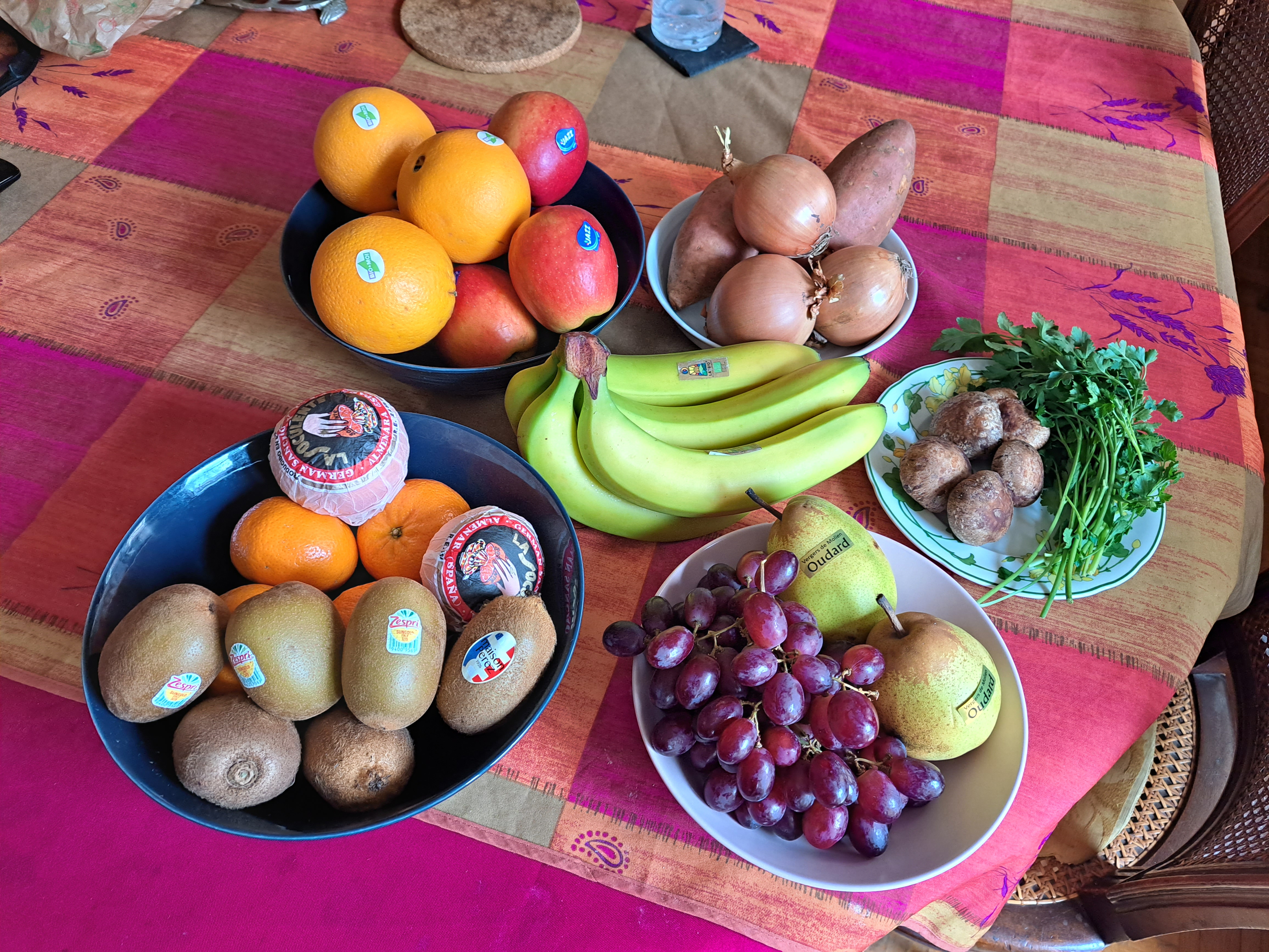 결론은 마트 승 ! 오늘은 오셩에서 장을 보면서 과일을 이것저것 샀다. 요일장보다 확실히 저렴하게 과일을 살 수 있었다. 그런데 씨알은 요일장이 훨씬 큼. 좋은 상품은 시장으로 가고 크기나 당도에서 평균정도 하는 과일들이 마트로 가나보다. 사과 (재즈) 3개 3.24유로 사과 (엔비) 3개 4.01유로 유기농 바나나 5개달린것 1.99유로 고구마 1키로 3.99유로 귤 1키로 2.99유로 망고 2개 3.38유로 오이 1개 2.59유로 사과는 재즈 3알, 엔비 3알 총 6알을 샀다. 가격은 시장의 거의 반값이었다. (마트에서 키로당 재즈 3유로대, 엔비 2유로대 / 시장에서 키로당 재즈 5.95유로, 엔비 4.95유로) 재즈는 시장 물건이 훨씬 컸지만 엔비는 시장이랑 마트랑 크기에서 별로 큰 차이가 없는것..